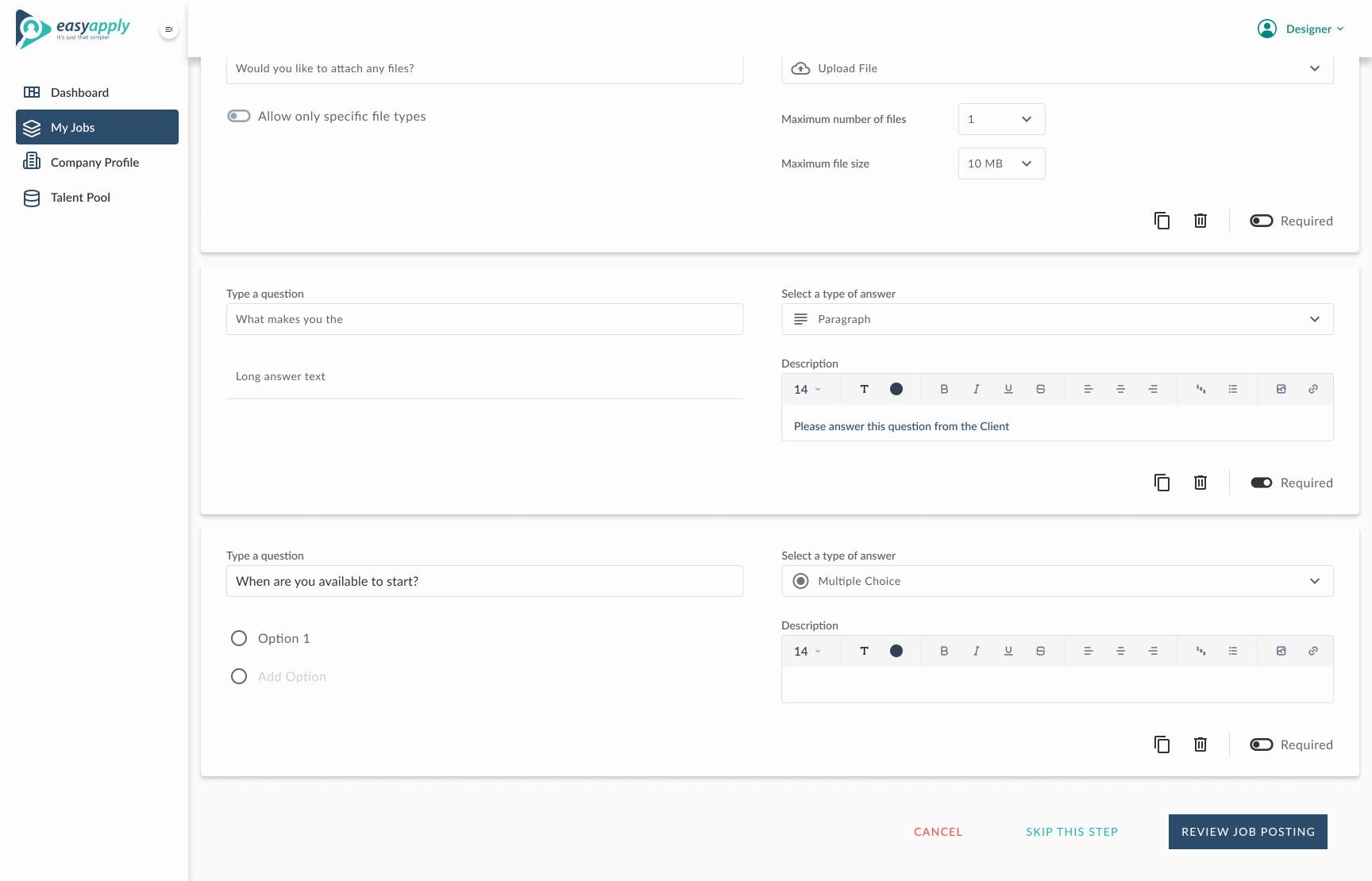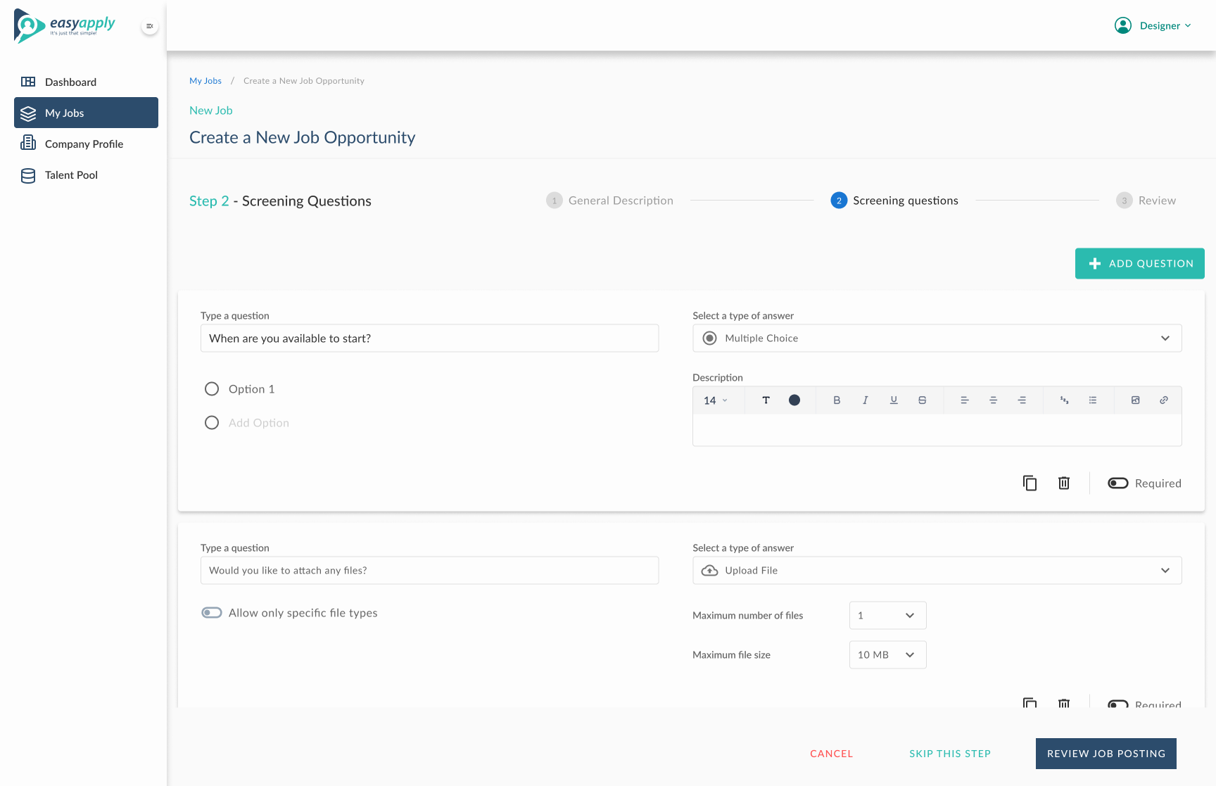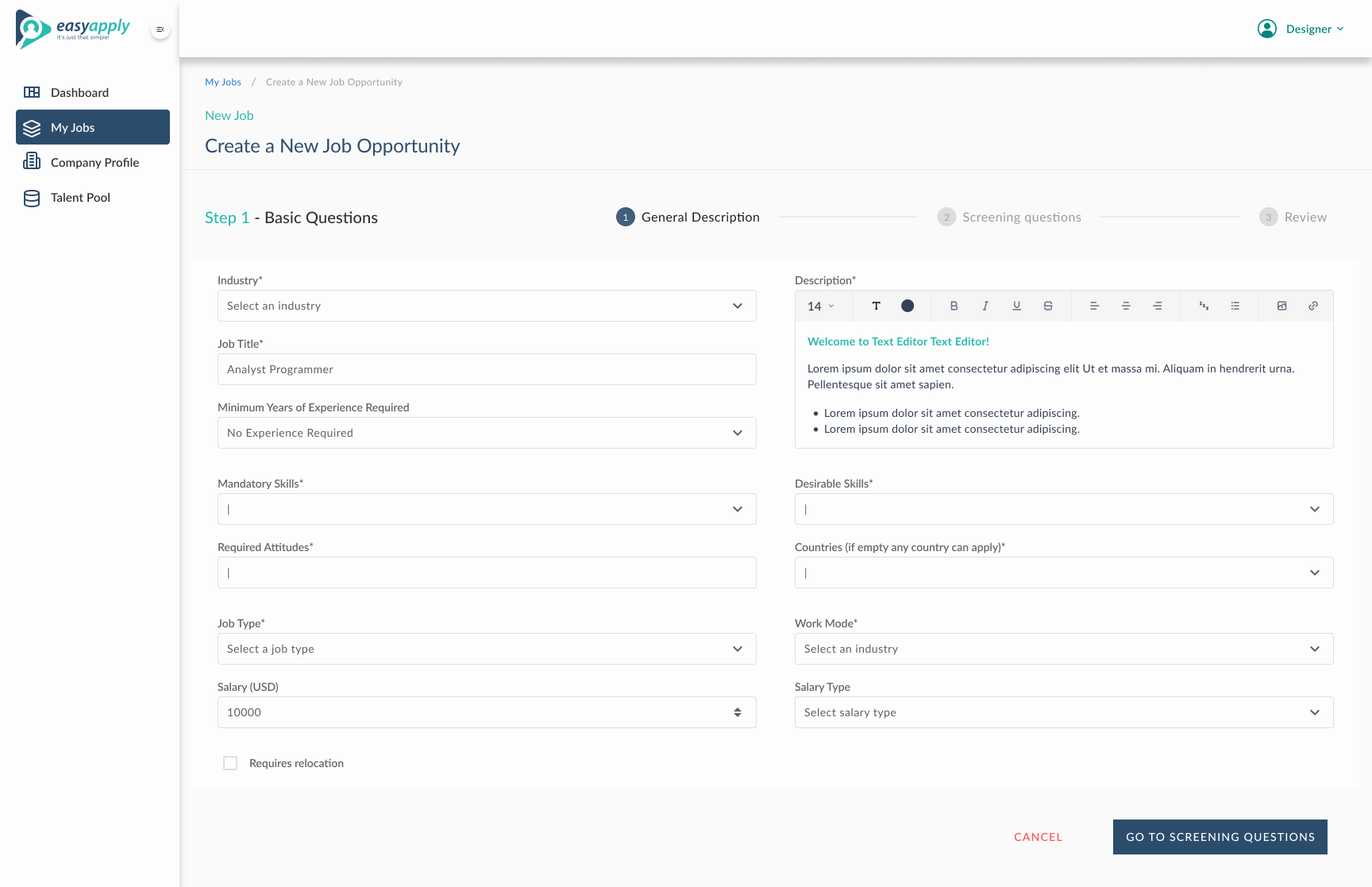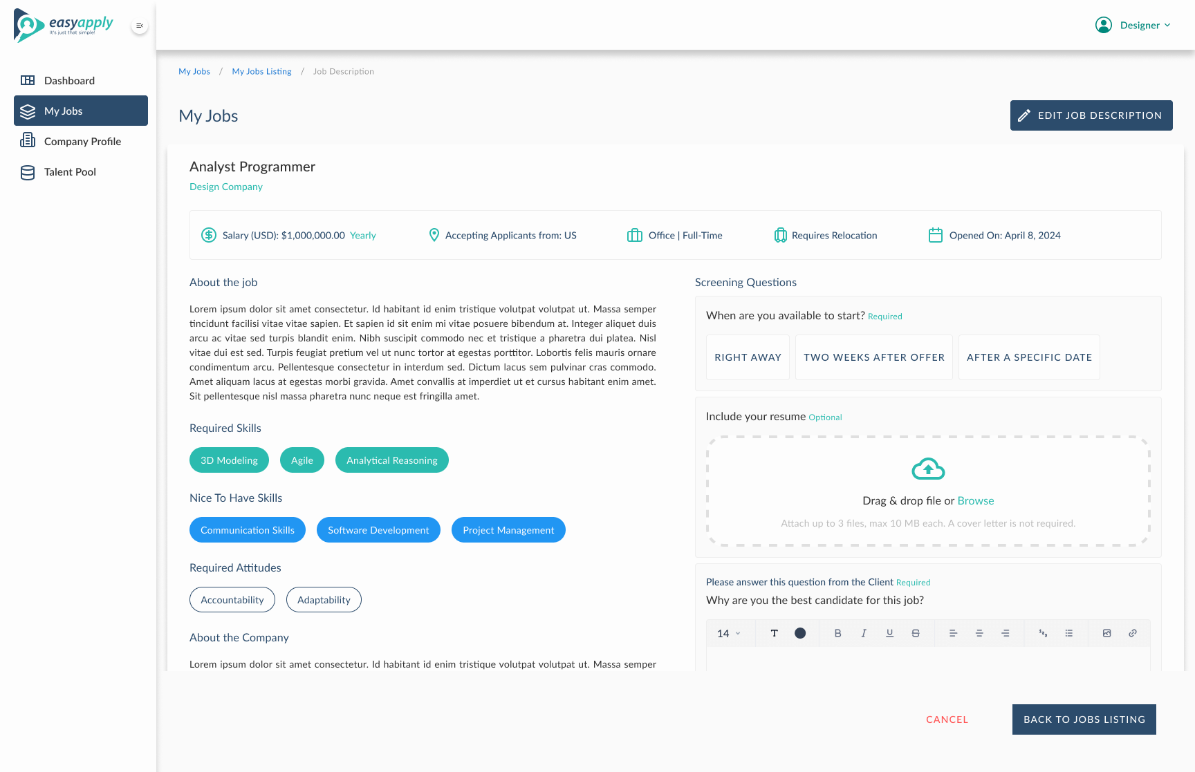 The platform’s innovative design not only streamlines recruitment but also fosters meaningful connections, helping companies and candidates find the perfect fit. Easy Apply is more than just a hiring platform—it’s a movement to make recruiting smarter, faster, and more personal.